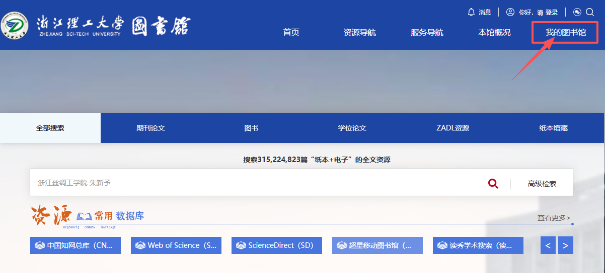 打开图书馆网站,点击右上角“我的图书馆”。