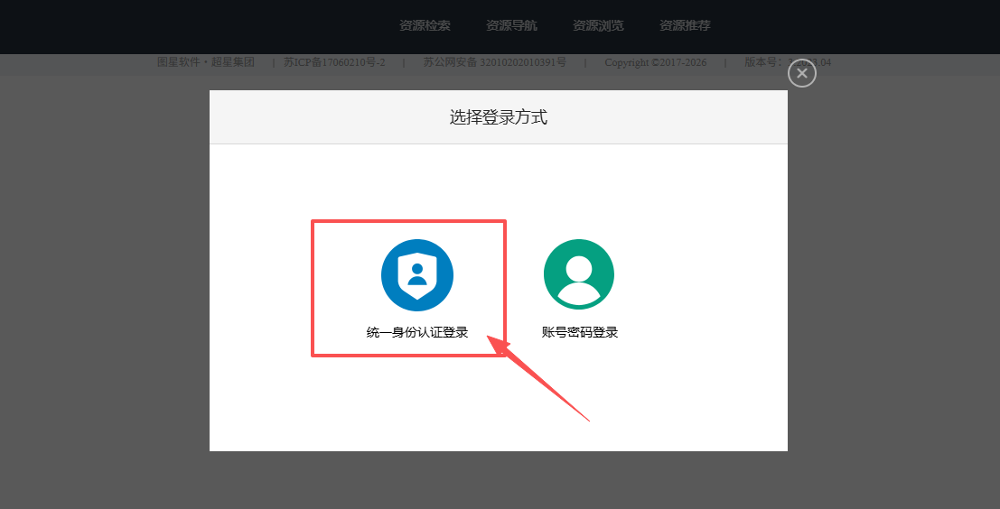 点击后,会跳转到图书管理系统登录选择页面,请选择“统一身份认证登录”。