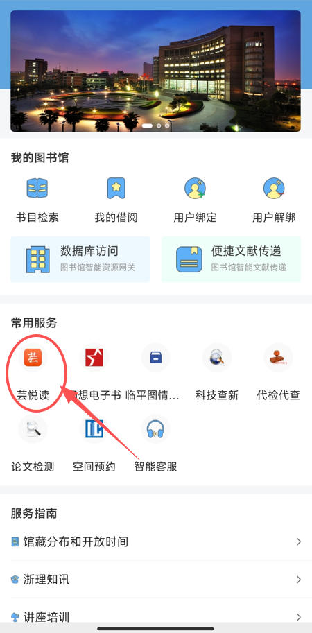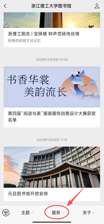 方式二:移动端。关注官方微信公众号“浙江理工大学图书馆”,点击底部“服务”菜单,再点击常用服务“芸悦读”图标进入平台。