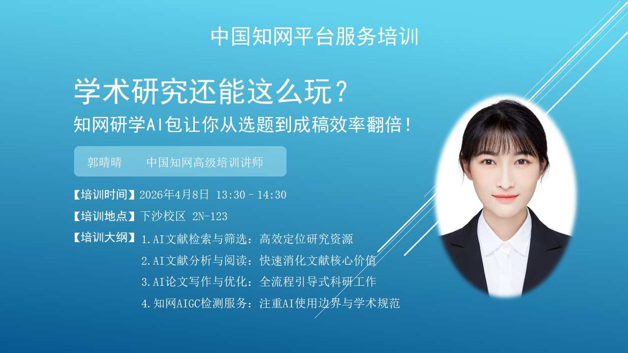 郭晴晴,出版专业硕士,中国知网高级培训讲师,具有丰富的高校、政府部门、企事业单位培训经验。